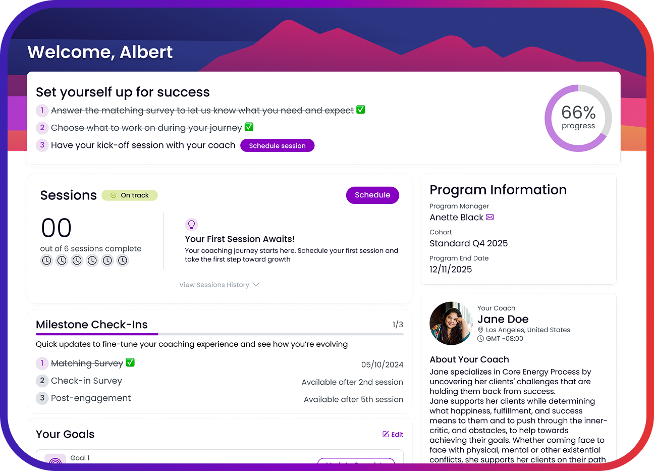 Each employee works with their coach to schedule live 1:1 sessions at a cadence that works best for both of them. To ensure flexible scheduling, coaching takes place over video or voice call, with sessions occurring over several months.